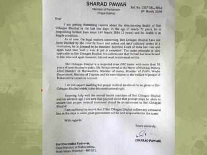 गेल्या महिन्यात ८ मार्चला शरद पवार यांनी मुख्यमंत्री देवेंद्र फडणवीस यांना एक खरमरीत पत्र लिहिलं होतं. छगन भुजबळ यांची प्रकृती खालावली असून त्यांची तब्येत आणखी बिघडल्यास त्याला सर्वस्वी सरकार जबाबदार असेल, असा इशारा त्यांनी दिला होता. गेल्या दोन वर्षापासून छगन भुजबळ तुरुंगात आहेत. त्यांचं वय ७१ वर्ष आहे. तुरुंगात राहिल्याने त्यांच्या आरोग्यावर विपरित परिणाम झाला आहे. त्यांना वेळेवर आणि योग्य उपचार मिळावेत, अशी मागणी पवार यांनी या पत्राद्वारे केली होती.