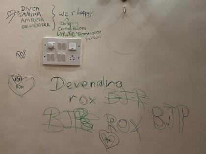 देवेंद्र फडणवीस यांची मुलगी दिविजानं लिहिलं असल्याचे सांगण्यात येत होते. मात्र देवेंद्र फडणवीस यांनी बंगला सोडण्यापूर्वी आम्ही एक एक कोपरा चेक केला होता. तेव्हा असं काहीही लिहिलेलं आढळलं नव्हतं. तसेच दिविजानं तर असं काही लिहिण्याचा प्रश्नच नसल्याचं देवेंद्र फडणवीस यांनी सांगितले. तसेच आमची बदनामी करण्यासाठी अतिशय खालच्या स्तरावरील राजकारण करत असल्याचा आरोप देखील देवेंद्र फडणवीस यांनी यावेळी केला.