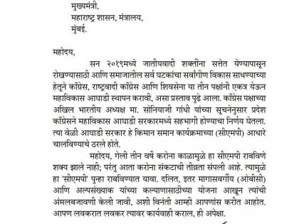 मुख्यमंत्र्यांना लिहिलेल्या पत्रात नाना पटोले म्हणतात, जातीयवादी शक्तींना सत्तेत येण्यापासून रोखण्यासाठी आणि समाजातील सर्व घटकांचा सर्वांगिण विकास साधण्याच्या हेतूने २०१९ साली तीन पक्ष एकत्र आले. अखिल भारतीय काँग्रेस कमिटीच्या अध्यक्षा मा. सोनियाजी गांधी यांच्या सुचनेनुसार किमान समान कार्यक्रमाच्या आधारे हे सरकार चालेल असे ठरलेले आहे. राज्यातील सर्व समाज घटकांना न्याय देण्याची काँग्रेस पक्षाची भूमिका राहिलेली आहे. सोनियाजी गांधी यांनी दलित, ओबीसी, आणि अल्पसंख्याक समाजाच्या कल्याणासाठीच्या योजनांवर सरकारने काम करावे यासाठी मुख्यमंत्र्यांना याआधीही पत्र पाठवले होते. कोरोनामुळे राज्य सरकारपुढे अडचणी होत्या पण या कठीण प्रसंगीही मुख्यमंत्री उद्धव ठाकरे यांच्या नेतृत्वाखाली मविआ सरकारने चांगले काम केले आहे. आता सर्व व्यवहार सुरुळीत सुरु असून अर्थव्यवस्थाही रुळावर आलेली आहे. आता सीएमपी व दलित, ओबीसी अल्पसंख्याक समाजाच्या कल्याणकारी योजनांची अंमलबाजवाणी करण्याची कार्यवाही लवकरात लवकर करावी.