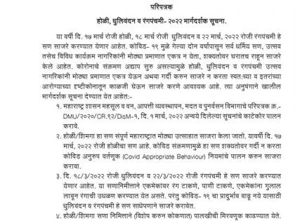 यंदा १७ मार्च, २०२२ रोजी होळीचा सण आहे. कोविड संक्रमणामुळे हा सण शक्यतोवर गर्दी न करता कोविड अनुरुप वर्तणूक (Covid Appropriate Behaviour) नियमांचे पालन करुन साजरा करावा. तसेच दि. १८ मार्च रोजी धूलिवंदन व २२ मार्च रोजी रंगपंचमी हे सण साजरे करण्यात येणार आहेत. या सणानिमित्ताने एकमेकांवर रंग टाकणे, पाणी टाकणे, एकमेकांना गुलाल लावून रंगांची उधळण करण्यात येत असते. परंतु कोविड १९ चा प्रादुर्भाव वाढू नये यासाठी धुलिवंदन व रंगपंचमी हे सण साधेपणाने साजरे करावेत.
