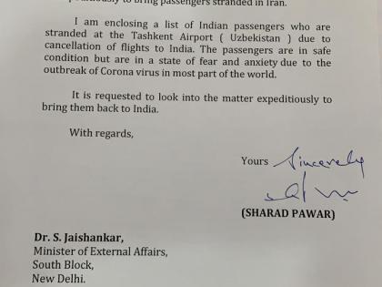 मुंबई - जगभरात कोरोनाचा फैलाव झाल्याने आंतरराष्ट्रीय वाहतूकीवर त्याचा परिणाम झाला आहे. त्या पार्श्वभूमीवर विदेशातील अनेक फ्लाईट्स बंद करण्यात आल्या आहेत. मात्र, याच कालावधीत उझबेकिस्तानमध्ये जवळपास 39 भारतीय नागरिक अडकून पडले आहेत. आपल्या नियोजित दौऱ्यानुसार या महाराष्ट्रीयन नागरिकांनी उझबेकिस्तान गाठले होते. मात्र, त्यांचा परतीचा मार्ग अनिश्चित काळासाठी बंद झाला आहे. त्यामध्ये बहुतांश डॉक्टरांचा समावेश आहे. राष्ट्रवादीचे नेते आणि खासदार शरद पवार यांनी यासंदर्भात परराष्ट्रमंत्री जयशंकर यांना पत्र लिहले आहे.