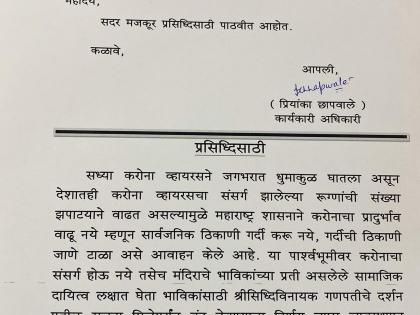 सध्या कोरोना व्हायरसने जगभरात धुमाकूळ घातला असून देशातही कोरोना व्हायरसचा संसर्ग झालेल्या रूग्णांची संख्या झपाटयाने वाढत आहे. महाराष्ट्र शासनाने कोरोनाचा प्रादुर्भाव वाढू नये म्हणून सार्वजनिक ठिकाणी गर्दी करू नये, गर्दीची ठिकाणी जाणे टाळा, असे आवाहन केले आहे. या पार्श्वभूमीवर कोरोनाचा संसर्ग होऊ नये, तसेच मंदिराचे भाविकांच्या प्रती असलेले सामाजिक दायित्व लक्षात घेता भाविकांसाठी श्री सिद्धिविनायक गणपतीचे दर्शन पुढील सूचना मिळेपर्यंत बंद ठेवण्याचा निर्णय न्यास व्यवस्थापन समितीने घेतला आहे. परंतु, सदर कालावधीत न्यासातर्फे देण्यात येणारी वैद्यकीय मदत, मदत कक्ष रुग्णांसाठी सुरु राहणार असल्याचे मंदिर प्रशासनाने जाहीर केले आहे.