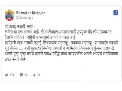 काँग्रेसचे ज्येष्ठ नेते आणि प्रवक्ते रत्नाकर महाजन यांनी उद्धव ठाकरेंवर कुरघोडी करण्याचा प्रयत्न केला आहे. कोरोना हा एक आजार आहे. तो आटोक्यात आणण्यासाठी उपयुक्त वैद्यकीय उपचार व वैज्ञानिक विचार, दृष्टीची व व्यवहार्य उपायांची गरज आहे. त्याऐवजी महाभारतकी लडाई, शिवरायांचा महाराष्ट्र, लढवय्या महाराष्ट्र, या लढाईत लढणारे शूर सैनिक.... अशी युद्धज्वर निर्माण करणारी व अस्मितेला विनाकारण फुंकर घालणारी भाषणे पुन:पुन्हा करणे म्हणजे प्रत्यक्ष उद्दिष्ट साध्य करण्यातील आपले अपयश लपविण्याचा प्रयत्न करणे आहे, असंही रत्नाकर महाजन म्हणाले आहेत.
