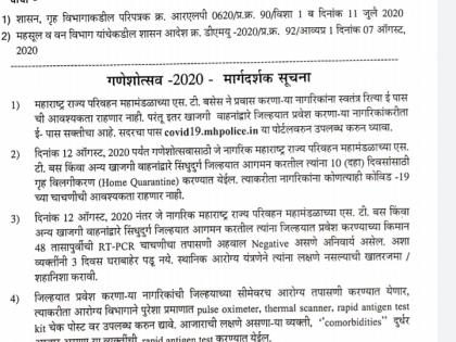 याबरोबरच सिंधुदुर्गवासियांनाही गणेशोत्सवासाठी जिल्हाधिकाऱ्यांनी महत्त्वपूर्ण सूचना केल्या आहेत. त्यामध्ये यावर्षी गणेशोत्सव हा कमीत कमी दिवसांचा साजरा करावा. गणपतीची पूजा पुरोहितामार्फत न करता स्वत: करावी किंवा तंत्रज्ञानाचा वापर करून करावी. आगमन विसर्जनाला मिरवणूक काढू नये. आरती, भजने, फुगड्या, गौरी, वसा आदी कार्यक्रम घरच्या घरी गर्दी होऊ न देता करावेत. कार्यक्रमानिमित्त घरोघरी भेटी देणे टाळावे. गावातील वाडीतील गणपतींचे विसर्जन एकत्रित करू नये.