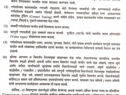 सार्वजनिक गणेशोत्सव मंडळांनी तहसिलदारांची परवानगी घेऊन, भपकेबाजपणा टाळून छोट्या मंडपात गणेशोत्सव साजरा करावा. मंडपात गर्दी होणार नाही याची काळजी घ्यावी. दर्शनाला येणाऱ्या भाविकांची नोंद ठेवावी, म्हणजे कॉन्टॅक्ट ट्रेसिंग शक्य होईल, तसेच ऑनलाइन दर्शनाव भर द्यावा, दर्शनाला येणाऱ्या भाविकांमध्ये सोशल डिस्टंसिंग पाळले जाई याची काळजी घ्यावी.