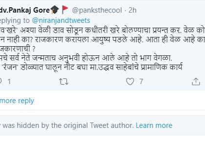 सध्या महाराष्ट्राला शून्य प्रशासनाचा अनुभव असणाऱ्या मुख्यमंत्री उद्धव ठाकरेंची नाही, तर आपत्ती व्यवस्थापनात अनुभवी असणाऱ्या प्रशासकाची म्हणजेच देवेंद्र फडणवीस यांची गरज आहे, असे ट्विट डावखरे यांनी केलंय. डावखरेंच्या या ट्विटचा नेटीझन्सने चांगलाच समाचार घेतलाय. डावखरेंना अर्वाच्य शब्दात काही ट्विटर युजर्संने सुनावले आहे. तर अनेकांनी सभ्य भाषेत, ही वेळ राजकारण करायची नसल्याचं म्हटलंय.