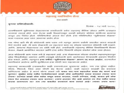 मुंबई - देशासह महाराष्ट्र राज्यात कोरोनाने हैदोस घातला असून कोरोना व्हायरसची लागण झालेल्या रुग्णांची संख्या दिवसेंदिवस वाढत आहे. कोरोनाचा फैलाव संपूर्ण देशात हळूहळू वाढत चालला असून महाराष्ट्र नवनिर्माण सेनेने कोरोना या महामारीचे गांभीर्य लक्षात घेऊन ‘गुढीपाडवा मेळावा’ रद्द करत असल्याचा निर्णय जाहीर केला आहे.