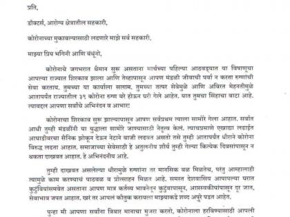 पुन्हा मी आपणा सर्वांना त्रिवार मानाचा मुजरा करतो, कोरोनाला हरविण्यासाठी आपली लढाई अशीच सुरू ठेवू या. ‘मीच माझा रक्षक’ हा संदेश आपण सर्वसामान्यांना दिला आहे. आपणही आपल्या प्रकृतीची काळजी घ्या, असा आपुलकीचा सल्ला देतानाच आपल्या काही सूचना असतील तर माझ्यापर्यंत जरूर पोहोचवा, असे आवाहनही शेवटी आरोग्यमंत्र्यांनी या पत्रात केलं आहे.