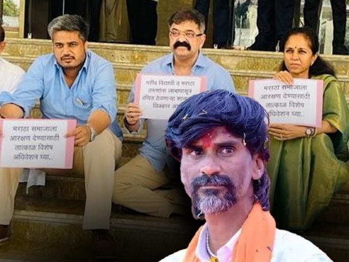 मुंबई - राज्यातील मराठा आंदोलक हिंसक होत असून आज सरकारच्यावतीने सर्वपक्षीय बैठक बोलावण्यात आली आहे. या बैठकीला राष्ट्रवादी काँग्रेसचे सर्वेसर्वा शरद पवार स्वत: उपस्थित आहेत. एकीकडे ही बैठक सुरू असतानाच दुसरीकडे राष्ट्रवादी शरद पवार गटाच्या आमदारांनी विधानभवन पायऱ्यावर आंदोलन केले. सरकारने मराठा समाजाला आरक्षण द्यावे, त्यासाठी एकदिवसीय विशेष अधिवेशन बोलवावे, अशी मागणी खासदार सुप्रिया सुळेंच्या नेतृत्वात आमदार जिंतेद्र आव्हाडांसह राष्ट्रवादीच्या आमदारांनी केली आहे.