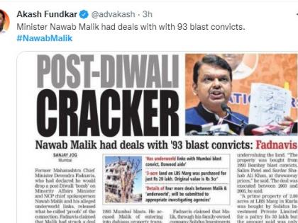 नवाब मलिक यांना अटक झाल्यानंतर आता देवेंद्र फडणवीस यांचं ते विधान चर्चेत आलं आहे. एका भाजप नेत्यानं फडणवीसांचं त्या विधानाची बातमी शेअर करत मलिक यांच्यावर निशाणा साधला आहे. बुलढाणा जिल्ह्याचे भाजपा अध्यक्ष आणि खामगांवचे आमदार आकाश फुंडकर यांनी हे ट्विट केलं आहे. त्यामध्ये, 'मंत्री नवाब मलिक यांनी 93 च्या बॉम्बस्फोटातील दोषींशी व्यवहार केला होता', असे फुंडकर यांनी म्हटलं आहे.