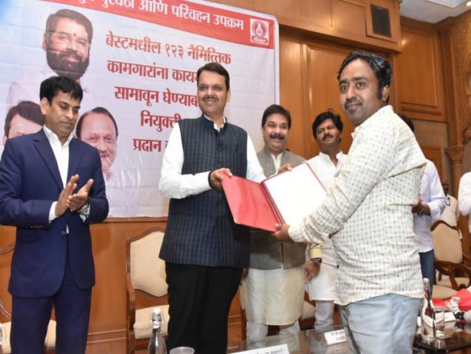 १२३ नैमित्तिक कामगारांना कायम सेवेत सामावून घेण्याबाबतचे नियुक्ती पत्र, मुंबईतील सह्याद्री शासकीय अतिथी गृह येथे राज्याचे उपमुख्यमंत्री देवेंद्र फडणवीस यांच्या हस्ते काल प्रदान करण्यात आले. यावेळी प्रातिनिधिक स्वरुपात १० कामगारांना नियुक्ती पत्र देण्यात आली. उर्वरित कामगारांना बेस्ट प्रशसकीय भवन (इलेक्ट्रिक हाउस) कुलाबा येथे नियुक्ती पत्रांचे वाटप करण्यात आले.