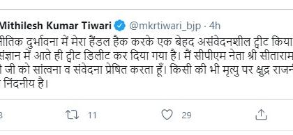 विशेष म्हणजे मथिलेश कुमार तिवारी यांनी जितेंद्र आव्हाड यांनी ट्विट करण्यापूर्वीच आपलं ट्विट डिलीट केलं आहे. तसेच, माझे अकाऊंट हॅक झाले होते, त्यातूनच हे असंवेदशील ट्विट करण्यात आले. ही बाब लक्षात येताच ते ट्विट डिलीट करण्यात आलंय. कुठल्याही निधनावर राजकारण हे निंदात्मक आहे. मी सिताराम येचुरी यांच्या दु:खात सहभागी असून सांत्वन करतो, असे स्पष्टीकरणाचे ट्विटही मिथिलेश कुमार यांनी केलंय.