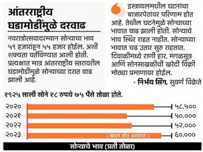 आता सोन्याचे भाव प्रतितोळा ६० हजार रुपये असून, दिवाळीत कदाचित हा भाव प्रतितोळा ६५ हजार होईल, अशी शक्यता सराफांनी वर्तविली आहे. त्यामुळे ऐन नवरात्रोत्सवातच सोने खरेदीसाठी दक्षिण मुंबईतल्या झवेरी बाजारात ग्राहकांची लगबग सुरू आहे.