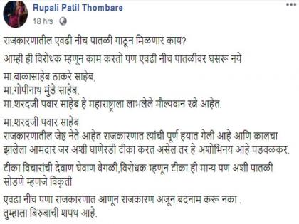 राजकारणातील एवढी नीच पातळी गाठून मिळणार काय, असा सवाल रुपाली पाटील यांनी उपस्थित केला आहे. तसेच आम्ही देखील विरोधक म्हणून काम करतो पण एवढी नीच पातळीवर घसरू नये, असं रुपाली पाटील यांनी सांगितले. दिवंगत शिवसेनाप्रमुख बाळासाहेब ठाकरे, दिवंगत भाजपाचे नेते गोपीनाथ मुंडे, राष्ट्रवादीचे अध्यक्ष शरद पवार हे महाराष्ट्राला लाभलेले मौल्यवान रत्ने आहेत.