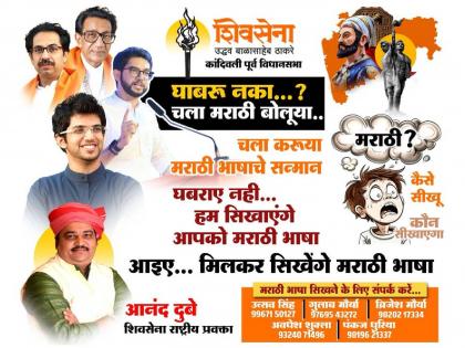 उद्धवसेनेच्या वतीने कांदिवली पूर्व विधानसभा मतदारसंघात हे बॅनर लावण्यात आलेत. त्यात घाबरू नका, चला मराठी बालूया असं म्हणत हम आपको मराठी भाषा सिखाएंगे असं म्हटलं आहे. आनंद दुबे यांनी लावलेल्या या पोस्टरमध्ये मराठी भाषेत काही मजकूर छापला आहे त्यात व्याकरणाच्या चुकाही दिसून येतात. घाबरू नका या वाक्यापुढे प्रश्नचिन्ह देण्यात आलं आहे. त्याशिवाय चला करू या, मराठी भाषेचा सन्मान ऐवजी, चला करूया मराठी भाषाचे सन्मान असं छापण्यात आले आहे.