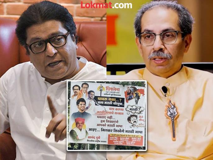 गेल्या काही दिवसांपासून मुंबईत मराठी-अमराठी वाद पुन्हा उफाळून आला आहे. कांदिवलीच्या एअरटेल गॅलरीत मराठी भाषा बोलणाऱ्या तरुणासोबत कर्मचाऱ्याने घातलेला वाद व्हायरल झाला. त्यानंतर मनसेकडून आंदोलन करत एअरटेल कंपनीला इशारा देण्यात आला. त्याशिवाय एका हिंदी भाषिक सुरक्षा रक्षकाकडून मराठी गया तेल लगाने असं विधान करण्यात आले. त्यालाही मनसे कार्यकर्त्यानी चोप दिला. मराठी भाषेच्या आग्रहासाठी मनसे कार्यकर्त्यांकडून सध्या बँकांमध्ये निवेदन देण्यात येत आहे. त्यात काही ठिकाणी परप्रांतीय कर्मचाऱ्यांसोबत वादंगाचे प्रसंग उभे राहत आहेत. त्या पार्श्वभूमीवर उद्धव ठाकरे यांच्या पक्षाकडून मुंबईत हा बॅनर लावून मनसेला डिवचण्यात आले आहे.