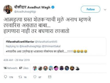 भाजपाचे प्रवक्ते अवधूत वाघ ट्विटरवर 'चौकीदार अवधूत वाघ' या अकाऊंटवरुन सक्रीय आहेत. याच अकाऊंटवरुन त्यांनी एक ट्विट करत आत्महत्याग्रस्त शेतकऱ्यांच्या मुलांची चेष्टा केली. मराठा क्रांती वॉरियर या ट्विटर हँडलवरुन करण्यात आलेल्या एका ट्विटला उत्तर देताना वाघ यांनी पातळी सोडली. शेतकरी पुत्र आणि सर्वसामान्यांचा आवाज असणाऱ्या असलेल्या पत्रकारांना ट्रोल करू नका, असा इशारा मराठा क्रांती वॉरियरकडून देण्यात आला होता. या ट्विटला 'आत्महत्याग्रस्त शेतकऱ्याची मुले अनाथ म्हणजे लावारिस असतात बाबा...', असं उत्तर वाघ यांनी दिलं. वाघ यांनी केलेल्या या विधानामुळे नव्या वादाला तोंड फुटलंय.