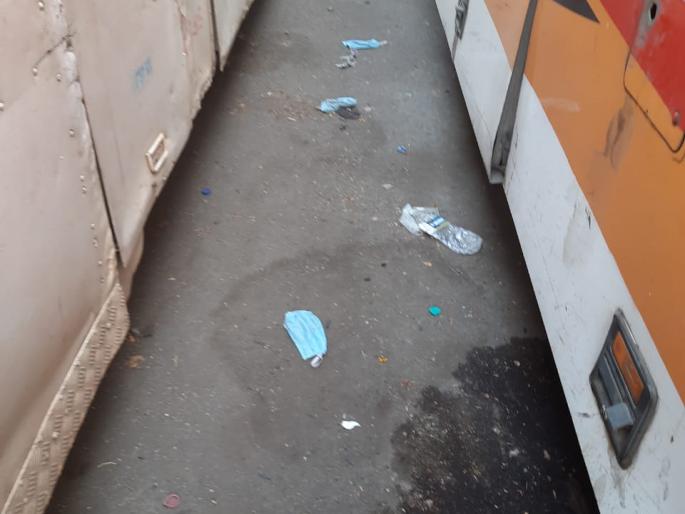 आगारात सफाई कर्मचाऱ्यांची कमतरता असल्याने मास्क आणि इतर कचरा वाढत आहे. मास्क जमिनीवर पडून राहिल्याने कोरोनाचा संसर्ग वाढण्याची भीती आहे.