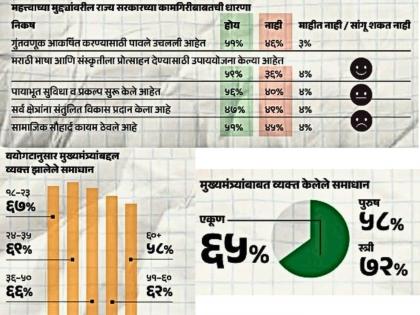 राज्याच्या कामगिरीबाबतच्या सर्वेक्षणात एकूण चित्र सकारात्मक आहे. विविध सामाजिक गटांमध्ये समाधानाचा वेगळा ठसा उमटताना दिसतो. महिलांनी सरकारला सर्वाधिक पसंती देत अग्रस्थानी स्थान मिळवले असून, तरुणांपासून मध्यमवयीन लोकांपर्यंत समाधानाचा कल स्थिर आहे. भौगोलिकदृष्ट्या विदर्भ आणि पश्चिम महाराष्ट्र हे विभाग सरकारच्या बाजूने ठाम उभे आहेत, तर उत्तर महाराष्ट्रात प्रतिसाद तुलनेने सौम्य दिसतो. समाजघटकांमध्ये गैर- मराठा जनरल गटाचा समर्थन दर सर्वाधिक ठळक आहे. राज्य सरकारविषयी एकूण समाधानाचा सूर सकारात्मक आहे.