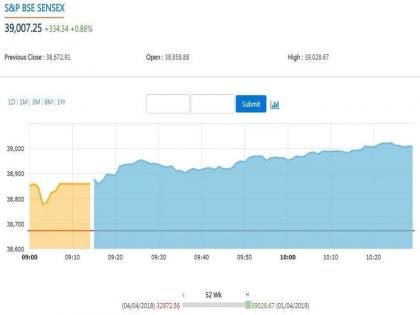 Sensex touches all time high, crosses 39,000 mark. It is currently at 39,007.95, up by +335.04 points. pic.twitter.com/SBNqkF7dmn