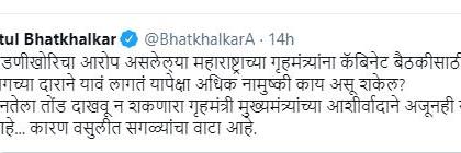 मुख्यमंत्र्यांसमवेतच्या बैठकीसाठी गृहमंत्री अनिल देशमुख हे मागच्या दाराने आल्याचं भाजपा नेते आमदार अतुल भातखळकर यांनी म्हटलंय. खंडणीखोरिचा आरोप असलेल्या महाराष्ट्राच्या गृहमंत्र्यांना कॅबिनेट बैठकीसाठी गपचूप मागच्या दाराने यावं लागतं यापेक्षा अधिक नामुष्की काय असू शकेल?, असा सवाल त्यांनी उपस्थित केलाय. जनतेला तोंड दाखवू न शकणारा गृहमंत्री मुख्यमंत्र्यांच्या आशीर्वादाने अजूनही खुर्चीवर आहे, कारण वसुलीत सगळ्यांचा वाटा आहे, असा गंभीर आरोप त्यांनी केलाय.