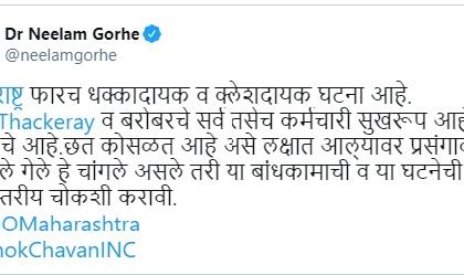 "महाराष्ट्रासाठी ही फारच क्लेशदायक आणि धक्कादायक घटना आहे. आदित्य ठाकरे आणि त्यांच्यासोबत असलेले सर्व कर्मचारी सुखरूप आहेत हे महत्त्वाचे. छत कोसळत आहे हे लक्षात आल्यावर प्रसंगावधान दाखवलं गेलं हे चांगलं असलं तरी या बांधकामाची आणि घटनेची उच्चस्तरीय चौकशी करण्यात यावी," अशी मागणी शिवसेनेच्या नेत्या निलम गोऱ्हे यांनी केली आहे.
