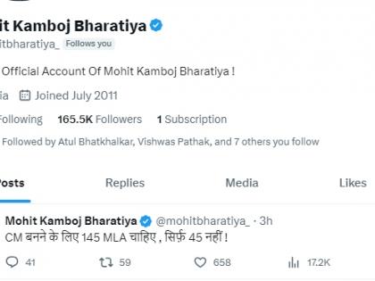 राष्ट्रवादीच्या कार्यकर्त्यांनी गेल्या काही दिवसापासून अजित पवार भविष्यातील राज्याचे मुख्यमंत्री असे पोस्टर्स लावले आहेत. तर आज मुंबईतील लालबागच्या राजाजवळही या आशयाची चिठ्ठी ठेवली. यावरुन आता पुन्हा एकदा मुख्यमंत्रिपदाचा मुद्दा चर्चेत आला आहे. दरम्यान, या पार्श्वभूमीवर भाजपचे नेते मोहित कंबोज यांच्या ट्विटनेही उलट-सुलट चर्चा सुरू आहेत. "मुख्यमंत्री होण्यासाठी ४५ नव्हे तर १४५ आमदार लागतात", असा टोला नाव न घेता मोहित कंबोज यांनी लगावला.