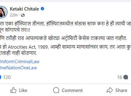 आता एका हॉस्पिटल डीनला, हॉस्पिटलमधील संडास साफ करा हे ही त्याची जात बघून सांगायचे तर. आणि तरीही राव आपल्याकडे खोट्या ॲट्रॉसिटी केसेस टाकल्या जात नाहीत, असे म्हणत खासदारांवर दाखल केलेला गुन्हा खोटा असल्याचं केतकीनं सुचवलं आहे. तसेच, जय हो Atrocities Act, 1989. आम्ही सामान्य माणासांवर काय, तर आता कुठल्या पदालाही नाही सोडणार, असे म्हणत केतकीने ॲट्रॉसिटी कायद्याचा गैरवापर होत असल्याचंच सूचवलंय.
