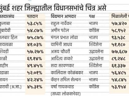 मुंबई - मुंबई शहर जिल्ह्यात एकूण १० विधानसभा मतदारसंघ असून, सध्या महायुतीतील भाजपचे त्यापैकी चार जागांवर, तर शिंदेसेनेचे दोन जागांवर आमदार आहेत, तर महाविकास आघाडीतील उद्धवसेना, काँग्रेसचे प्रत्येकी दोन आमदार आहेत. लोकसभा निवडणूक निकालाच्या पार्श्वभूमीवर यंदा महायुतीला आपले मतदारसंघ कायम ठेवण्यासाठी झुंज द्यावी लागण्याची चिन्हे आहेत. त्यातही वरळी, माहीम आणि शिवडी या एकमेकांना लागून असलेल्या तीन मतदारसंघांमध्ये मनसेमुळे लक्षवेधी लढती होण्याचे स्पष्ट संकेत आहेत.