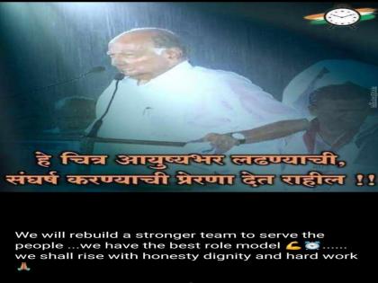 आज सुप्रिया सुळे यांनी व्हॉट्सअप स्टेटसला एक पोस्ट केलं आहे. त्यात शरद पवारांचा साताऱ्यातील पावसात केलेल्या भाषणाचा फोटो टाकला आहे, यात लिहिलं आहे की, हे चित्र आयुष्यभर लढण्याची, संघर्षाची प्रेरणा देईल. त्याचसोबत यापुढे पुन्हा मजबूत संघटनेची पुनर्बांधणी करून लोकांची सेवा करू, आमच्याकडे सर्वोत्कृष्ट आदर्श नेतृत्व आहे, आम्ही प्रामाणिकपणे आणि सन्मानाने, मेहनतीने पुढे जाऊ असं सुप्रिया सुळेंनी सांगितलं आहे.
