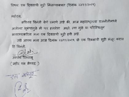 चंद्रपूर जिल्ह्याच्या गडचांदूर येथील सावित्रीबाई फुले कनिष्ठ महाविद्यालयातील एका शिक्षकाने प्राचार्यांना सुट्टीसाठी अर्ज केला आहे. विशेष म्हणजे राज्यातील राजकीय भुकंपाचा धक्का बसला असून मी हदरलो आहे. त्यामुळे मला 23 नोव्हेंबर रोजी एक दिवसाची सुट्टी मिळावी, असे म्हणत जहीर सैय्यद यांनी प्राचार्यांकडे रजेचा अर्ज केला. मात्र, प्राचार्यांनी रजा नामंजूर असे म्हणत तो अर्ज फेटाळून लावला आहे. भाजपा आणि राष्ट्रवादीच्या सरकारचं राजकीय नाट्य पाहून महाराष्ट्रातील अनेकांना धक्का बसला आहे. सकाळी सकाळी पेपर हातात घेण्यापूर्वीच आजचा पेपर रद्दी बनल्याचं पाहायला मिळालं.