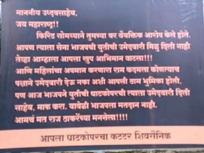 या पोस्टर्समध्ये लिहिण्यात आलं आहे की, किरीट सोमय्याने तुमच्यावर वैयक्तिक आरोप केले होते. आपण त्याला युतीची उमेदवारी मिळू दिली नाही तेव्हा आम्हाला आपला खूप अभिमान वाटला. आणि महिलांचा अपमान करणाऱ्या राम कदमला कोणत्याच पक्षाने उमेदवारी देऊ नका अशी आपली ठाम भूमिका होती. पण आज भाजपाने युतीची उमेदवारी राम कदम यांना दिली. त्यामुळे साहेब माफ करा, यावेळी भाजपाला मतदान नाही आमचं मत राज ठाकरेंच्या मनसेला, आपला घाटकोपरचा कट्टर शिवसैनिक अशा शब्दात आपल्या भावना व्यक्त करण्यात आल्या आहेत.