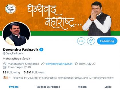 भाजपा विधिमंडळ नेतेपदी देवेंद्र फडणवीस यांची निवड झाल्यानंतर मुख्यमंत्रिपदाचे दावेदार तेच असणार हे स्पष्ट झालं होतं. मात्र सत्तास्थापनेच्या घोळात ना कोणाचं सरकार बनलं ना कोणी मुख्यमंत्री झालं. त्यामुळे अखेर देवेंद्र फडणवीसांनी सोशल मीडियावर स्वत:ची नवीन ओळख निर्माण केली आहे. ट्विटरवर देवेंद्र फडणवीस यांनी स्वत:ला महाराष्ट्र सेवक म्हणून संबोधित केलं आहे. लोकसभा निवडणुकीच्यावेळी काँग्रेसकडून चौकीदार चोर है असा प्रचार केला जात असताना भाजपाने नामी शक्कल शोधत मै भी चौकीदार मोहीम पुढे आणली होती. त्यानुसार पंतप्रधानांपासून भाजपाच्या कार्यकर्त्यांपर्यंत सगळ्यांनी आपल्या नावापुढे चौकीदार या शब्दाचा उल्लेख केला होता. तेव्हा देवेंद्र फडणवीस आणि राज्यातील भाजपा नेत्यांनी नावापुढे चौकीदार शब्दाचा उल्लेख केला होता.
