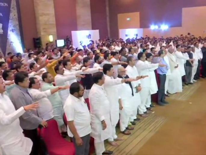मुंबई : राज्यातील सत्तासंघर्ष असता सर्वोच्च न्यायालयात पोहोचला असताना शिवसेना, काँग्रेस, राष्टÑवादी काँग्रेस आणि सहयोगी पक्षाच्या महाविकास आघाडीने सोमवारी मुंबईत १६२ आमदारांचे जोरदार शक्तीप्रदर्शन केले. बहुमत नसतानाही मणिपूर, गोवा या राज्यात भाजपने सत्ता स्थापन केली. पण हा गोवा नाही, महाराष्ट्र आहे. आमच्यावर काही चुकीचे लादले तर त्याला उत्तर देण्याची ताकद या महाराष्ट्रात आहे, असा सज्जड दम खा. शरद पवार यांनी भाजपला दिला. तर कुणी आडवा आला तर त्याचे काय करायचे हे शिवसेना पाहून घेईल, असा इशारा शिवसेना पक्षप्रमुख उद्धव ठाकरे यांनी दिला.मुंबईतील ग्रँड हयात या पंचतारांकित हॉटेलमध्ये महाविकास आघाडीच्या १६२ आमदारांची तिन्ही पक्षाच्या प्रमुख नेत्यांसमोर ओळखपरेड करण्यात आली. तसेच संविधान दिनाच्या पूर्वसंध्येला संविधानाच्या रक्षणासह मतदारसंघ आणि पक्षाशी एकनिष्ठ राहाण्याची शपथ देण्यात आली. आ. जितेंद्र आव्हाड यांनी ही शपथ सर्व आमदारांनी दिली.यावेळी बोलताना खा. शरद पवार यांनी भाजपसह अजित पवारांना इशारा दिला. ते म्हणाले, जाणीवपूर्वक काही गैरसमज पसरविले जात आहेत. अजित पवार यांच्यावर पक्षाने कारवाई केलेली आहे. व्हीपचा धाक दाखवून आमदारकी धोक्यात येईल अशी कोणी भीती घातली जात आहे. पण पदावरून दूर केलेल्या व्यक्तीला आता कोणताही अधिकार उरलेला नाही. त्यामुळे तुमचे कोणतेही नुकसान होणार नाही. मी संसद, घटनातज्ज्ञ आणि अनेक निवृत्त वरिष्ठांकडून स्पष्टता घेतली आहे. त्यामुळे तुम्ही कसलीही काळजी करु नका. सगळी जबाबदारी मी व्यक्तीगतरित्या घ्यायला तयार आहे, अशा शब्दात पवार यांनी आमदारांना धीर दिला.भाजपने कर्नाटक, गोवा, मणिपूर अशा अनेक राज्यात बहूमत नसताना सत्ता स्थापनेचे प्रयत्न केले. संसदीय प्रथा परंपरांना, मार्गदर्शक तत्वांना हरताळ फासून सत्ता चालवण्याचे काम भाजपने देशभरात केले आहे. आता महाराष्टÑाची वेळ आली आहे. २८८ आमदारांपैकी १६२ आमदार ज्या आघाडीकडे आहेत त्यांना सत्तेपासून दूर ठेवण्याचे प्रयत्न होत आहेत.यावेळी काँग्रेसतर्फे माजी मुख्यमंत्री अशोक चव्हाण, प्रदेशाध्यक्ष बाळासाहेब थोरात यांची भाषणे झाली. यावेळी मल्लिकार्जुन खरगे, प्रफुल्ल पटेल, राजू शेट्टी, आदित्य ठाकरे, संजय राऊत, छगन भुजबळ, जयंत पाटील, अबू आझमी, एकनाथ शिंदे, रामदास कदम, दिवाकर रावते, दिलीप वळसे पाटील, धनंजय मुंडे, नवाब मलिक हे नेते यावेळी उपस्थित होते.आता शिवसेना सोबत आहे : हे गोवा नाही. महाराष्टÑ आहे. येथे काहीही खपवून घेतले जाणार नाही. तसे करणाऱ्यांना धडा शिकवण्याची ताकद आमच्याकडे आहे. आता शिवसेना आपल्यासोबत आहे, तेव्हा धडा शिकवण्याच्या पध्दतीबद्दल मी फार काही सांगण्याची गरज नाही, असे शर