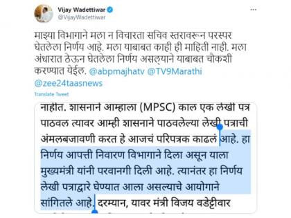 विजय वडेट्टीवार यांनी ट्विट करुन महत्वाची माहिती दिलीय. "माझ्या विभागानं मला न विचारताच सचिव स्तरावरुन परस्पर घेतलाला निर्णय आहे. मला याबाबत काहीही माहिती देण्यात आली नाही. मला अंधारात ठेऊन घेतलेला निर्णय असल्याने याबाबत चौकशी करण्यात येईल", असं ट्विट विजय वडेट्टीवार यांनी केलं आहे. (vijay waddetiwar tweets about enquiry of MPSC Commission officials)