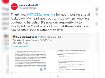 रविवारी मुख्यमंत्र्यांच्या उपस्थितीत बैठक झाल्यानंतर राज्यात 30 एप्रिलपर्यंत कडक निर्बंध लागू करण्यात आले आहेत. यासंदर्भात एसओपीही जारी करण्यात आली आहे. राज्यात 30 एप्रिलपर्यंत कडक निर्बंध लागू झाले असून आठवड्याच्या प्रत्येक शनिवारी आणि रविवारी विकेंड लॉकडाऊन करण्यात आला आहे. सीएमओकडून नियमावली जाहीर करण्यात आली आहे. महिंद्रा यांनी CMO Maharashtraचे ट्विटवर लिहिले की,''पूर्णपणे लॉकडाऊन न केल्याबद्दल मुख्यमंत्री उद्धव ठाकरे यांचे मी आभार मानतो. अथक परिश्रम करणाऱ्या दुकान मालकांबद्दल मला वाईट वाटते. आता कोरोना नियमांचे काटेकोर पालन करणे ही आपली जबाबदारी आहे. जेणेकरून ही निर्बंधही लवकरात लवकर उठवली जातील.''