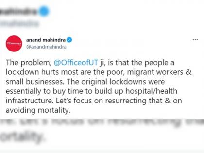 लॉकडाऊनच्या मुद्द्यावर आनंद महिंद्रा यांनी ट्विट केले आहे.  'उद्धवजी, समस्या अशी आहे की लॉकडाऊनचा फटका बसणाऱ्यांमध्ये सर्वाधिक गरीब, स्थलांतरित मजूर आणि लघु उद्योजक आहेत. मूळ लॉकडाऊन मूलत: रुग्णालये / आरोग्याच्या पायाभूत सुविधांच्या उभारणीसाठी करण्यासाठी होते. त्यावर पुन्हा लक्ष केंद्रित करूया आणि मृत्यू टाळूया', असा सल्ला आनंद महिंद्रा यांनी  ट्विट करत  ठाकरे सरकारला दिला आहे.