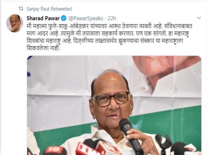 सूडबुद्धीनं कारवाई करणं ही महाराष्ट्राची संस्कृती नाही असं सांगत उद्धव ठाकरेंनी भाजपाला चिमटा काढला होता. त्यानंतर ईडीच्या मुद्द्यावरुन शरद पवारांनी पत्रकार परिषद घेतली. यामध्ये पवारांनी मी महात्मा फुले-शाहू-आंबेडकर यांच्यावर आस्था ठेवणारा व्यक्ती आहे. संविधानाबाबत मला आदर आहे. त्यामुळे मी तपासाला सहकार्य करणार. पण एक सांगतो, हा महाराष्ट्र शिवबांचा महाराष्ट्र आहे. दिल्लीच्या तख्तासमोर झुकण्याचा संस्कार या महाराष्ट्राला शिकवलेला नाही असं भाष्य केलं होतं. शरद पवारांच्या ट्विटरवरुन हे वाक्य शिवसेना नेते खासदार संजय राऊत यांनी रिट्विट केल्याने अनेकांच्या भूवया उंचावल्या आहेत.