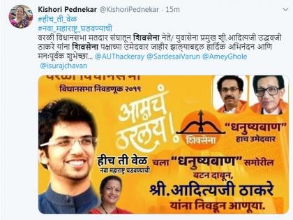 मुंबई - विधानसभा निवडणुकीच्या पार्श्वभूमीवर युती जाहीर होण्यापूर्वीच शिवसेनेने उमेदवारांना एबी फॉर्मचं वाटप केले आहेत. सगळ्यांची उत्सुकता लागलेल्या वरळी विधानसभा मतदारसंघातून शिवसेना पक्षप्रमुख उद्धव ठाकरेंचे चिरंजीव आदित्य ठाकरेंना उमेदवारी देण्यात आली आहे. शिवसेनेकडून अधिकृतरित्या आदित्यच्या नावाची घोषणा करण्यात आली आहे. मात्र शिवसेनेच्या ज्येष्ठ नगरसेविका किशोरी पेडणेकर यांनी ट्विट करुन आदित्य ठाकरेंना उमेदवारी जाहीर झाल्याबद्दल अभिनंदन व्यक्त केलं आहे.