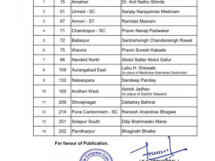 अंधेरी पश्चिम येथे आधी काँग्रेसने सचिन सावंत यांना उमेदवारी जाहीर केली होती, पण त्यांनी निवडणूक लढवण्यास नकार दिला त्यामुळे आता काँग्रेसने अशोक जाधव यांना उमेदवारी जाहीर केली. वरोरामधून प्रवीण काकडे यांना तिकिट जाहीर केले आहे. तर नालासोपारा विधानसभा मतदारसंघातून संदीप पांडे यांना उमेदवारी जाहीर केली आहे.