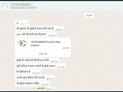 पोलिस ट्रॅफिक कंट्रोलला शनिवारी २६/११ प्रमाणे हल्ल्याची धमकी रात्री ११ च्या सुमारास मिळाली असे सूत्रांचे म्हणणे आहे. मुंबई वाहतूक नियंत्रण विभागाच्या WhatsApp वर पाकिस्तानी नंबरवरून धमकीचा संदेश पाठवण्यात आला होता. त्याचे 'लोकेशन ट्रेस' केल्यास ते भारताबाहेर असल्याचे आढळून येईल, असे मेसेंजरने सांगितले होते. मुंबईत हल्ला होईल, अशी धमकी संदेशवाहकाने दिली.