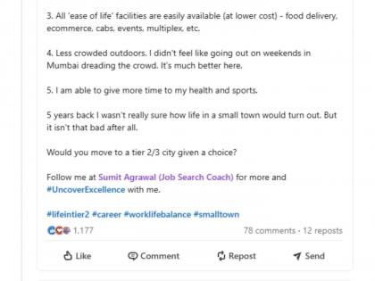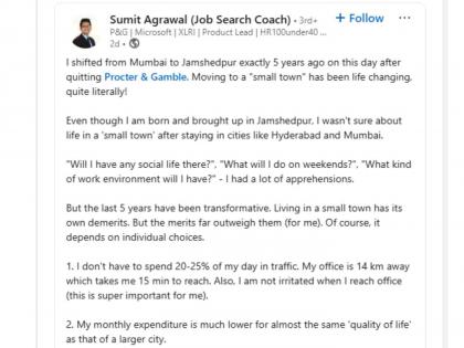 आपल्या निर्णयावर भाष्य करताना सुमीतने इतरांनाही एक प्रश्न विचारला आहे. तो म्हणतो, "पाच वर्षांपूर्वी, मला खरोखर खात्री नव्हती की एका लहान शहरातील जीवन कसं असेल. पण ते इतकं वाईट नाहीये. जर तुम्हाला पर्याय मिळाला तर तुम्ही टियर २ किंवा टियर ३ शहरात शिफ्ट होऊ शकता का?"