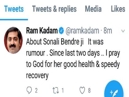 ''गेल्या दोन दिवसांपासून सोनाली बेंद्रे यांच्याबाबतची अफवा पसरली होती. त्यांच्या स्वास्थ्यासाठी व प्रकृतीत लवकरात लवकर सुधारणा व्हावी, अशी मी देवाकडे प्रार्थना करतो'', असे ट्विट करत राम कदम यांनी वादावर पडदा टाकण्याचा प्रयत्न केला.