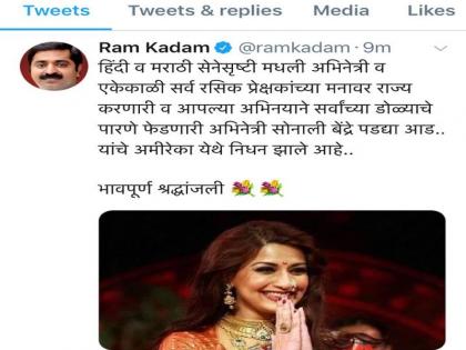 ''हिंदी व मराठी सिनेसृष्टीमधील अभिनेत्री व एकेकाळी सर्व रसिक प्रेक्षकांच्या मनावर राज्य करणारी व आपल्या अभिनयाने सर्वांच्या डोऴ्यांचे पारणे फेडणारी अभिनेत्री सोनाली बेंद्रे पडद्याआड. यांचे अमेरिकेत निधन झाले आहे'', अशा आशयाचे ट्विट राम कदम यांनी केले होते. सोशल मीडियावर सडकून टीका झाल्यानंतर राम कदम यांनी ट्विट डिलीट केले.