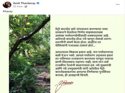 आपल्याला विकास हवाच आहे, पण पर्यावरणाचा बळी देऊन नको. आपलं पर्यावरण उद्धवस्त झालं, तर भविण्यात राजकारण करायला माणून नावाचा प्राणी शिल्लकच राहणार नाही, याचं भान सर्व राजकीय नेत्यांनी बाळगायला हवं. नवे मुख्यमंत्री आणि नवे उपमुख्यमंत्री यांनी आरेतील मेट्रो कारशेडबाबतच्या आपल्या निर्णयाचा पुनर्विचार करावा, ही आग्रहाची विनंती, असं अमित ठाकरे यांनी म्हटलं आहे.
