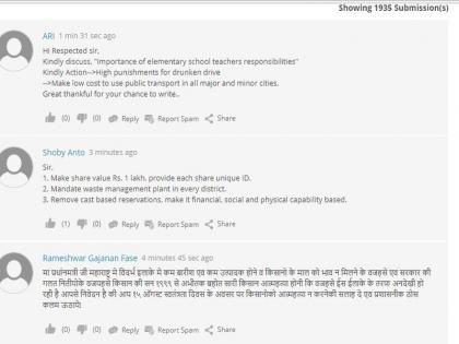 प्रत्येक नागरिकाच्या बँक खात्यात 15 लाख देणार होते, त्याचे काय झाले?. त्यावर बोलणार का ? असा प्रश्न काही जणांनी मोदींना विचारला आहे. तर काहींनी 2014 चा जाहीरनामा वाचून दाखवा, असाच सल्ला मोदींना दिला आहे. तसेच पाकिस्तान, राम मंदिर, गांधी-नेहरु एवढे सोडून रोजगार, मराठा आरक्षण, शेतकरी आत्महत्या, राफेल भ्रष्टाचार, 2 कोटी रोजगार याबाबत बोला, असाही सल्ला अनेक नेटीझन्सने मोदींना दिला आहे. तर अनेकांनी निरव मोदी, विजय मल्ल्या यांवर बोलण्याची सूचना मोदींना केली आहे. तर मोदींनी दिलेल्या MyGov.in या http://nbt.in/1Fy_Wa पेजवरही शेकडो कमेंट करुन प्रश्न विचारण्यात आले आहेत. तर एका नागरिकांने चक्क प्रश्नांची यादीच मोदींपुढे ठेवली आहे.