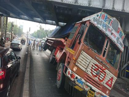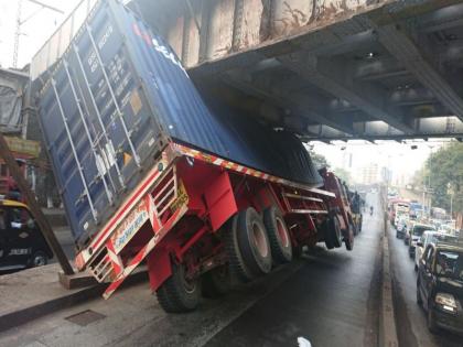 Mumbai: A container truck met with an accident at King Circle railway bridge in the early morning hours. pic.twitter.com/vJ2r6DdYaa