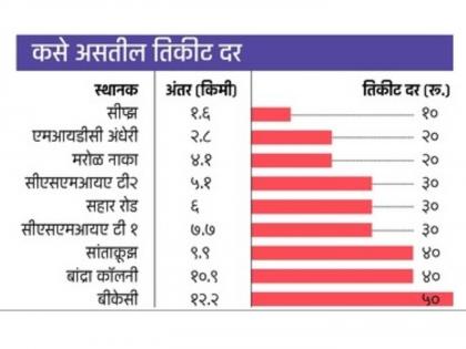 १. आरे जेव्हीएलआर ते मरोळ नाक्यापर्यंतच्या अंतरासाठी प्रवाशांना २० रुपये भाडे द्यावे लागणार आहे. तर आरे जेव्हीएलआर स्थानकापासून विमानतळ टी १ टर्मिनल स्थानकापर्यंत ३० रुपये भाडे आकारले जाणार आहे.