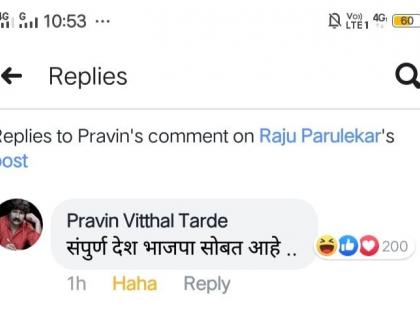 पत्रकार राजू परुळेकर यांनी फेसबुकवर एक पोस्ट लिहिली होती. त्यामध्ये, ''एकतर तुम्ही देशासोबत आहात किंवा तुम्ही भाजपासोबत आहात. ठरवा.'' अशी पोस्ट फेसबुकवर लिहिली होती. त्यांच्या या पोस्टवर अभिनेता प्रविण तरडेंनी कमेंट करताना, 'संपूर्ण देश भाजपासोबत' असे म्हटले. तरडेंच्या कमेंटवरुन नेटीझन्सने त्यांना चांगलच ट्रोल केलंय. विशेष म्हणजे जवळपास 2 हजार जणांनी तरडेंना कमेंटमधून उत्तर दिलंय. त्यामध्ये तरडेंच्या कमेंटचा समाचार घेतलेल्याच कमेंट सर्वाधिक आहेत.