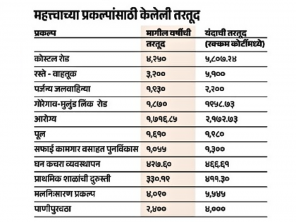 कोस्टल रोड, गोरेगाव- मुलुंड लिंक रोड, उडाणपूल, शिक्षण, पाणीपुरवठा प्रकल्प, आरोग्य यांसाठी भरीव निधीची तरतूद करण्यात आली आहे. 'बेस्ट' उपक्रमाच्या ढासळत्या डोलाऱ्याला टेकू देण्यासाठी एक हजार कोटी रुपयांचे अनुदान दिले जाणार आहे. मुंबईतील प्रदूषणाचा मुद्दा प्रशासनाच्या मुख्य अजेंड्यावर आहे. प्रदूषण प्रतिबंधात्मक उपाय योजण्यासाठी ११३.१८ कोटी रुपयांची तरतूद केली आहे.